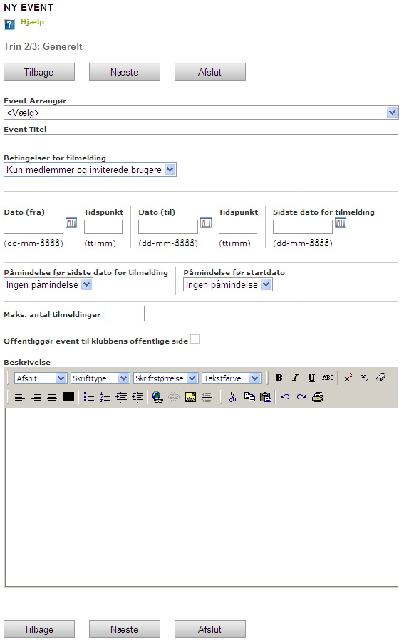 OBS! Det centrale her er, at "Event arrangør" sættes til den klub eller gruppe, som eventen tilhører. Herved vises eventen automatisk på siden "Events" under denne årgang.